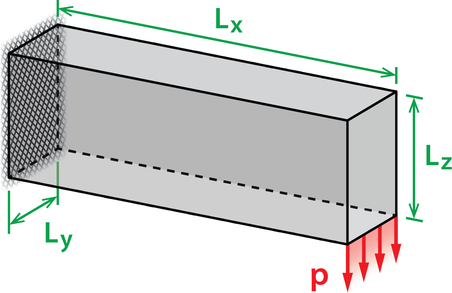 Rectangular cantilever domain clamped at the left side and loaded at the right by a distributed force applied at the lower edge.