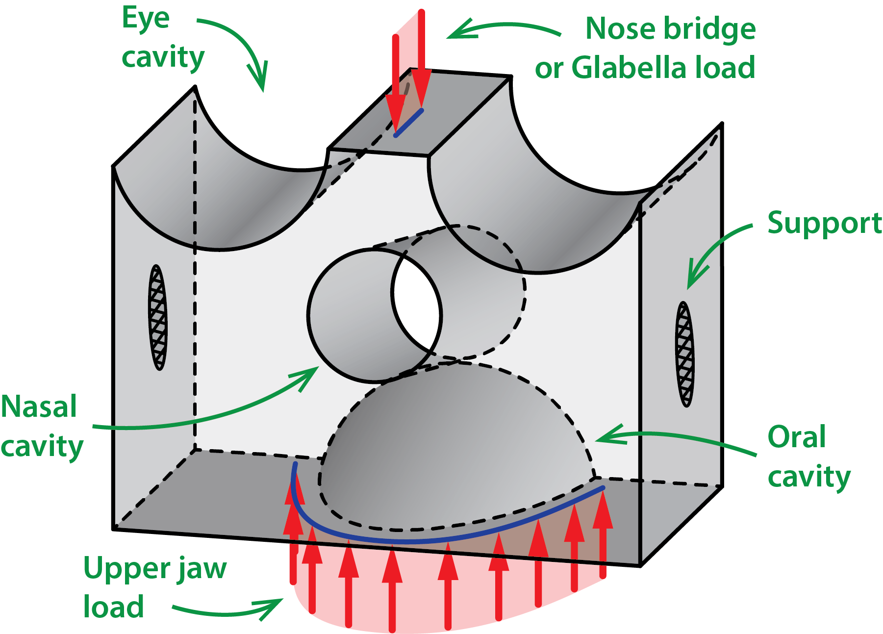 Topology optimized bone replacement for craniofacial trauma. The domain is patient-specific and procedurally-generated. Passive-void zones (not variables) for the eye, nasal and oral cavities are defined.
