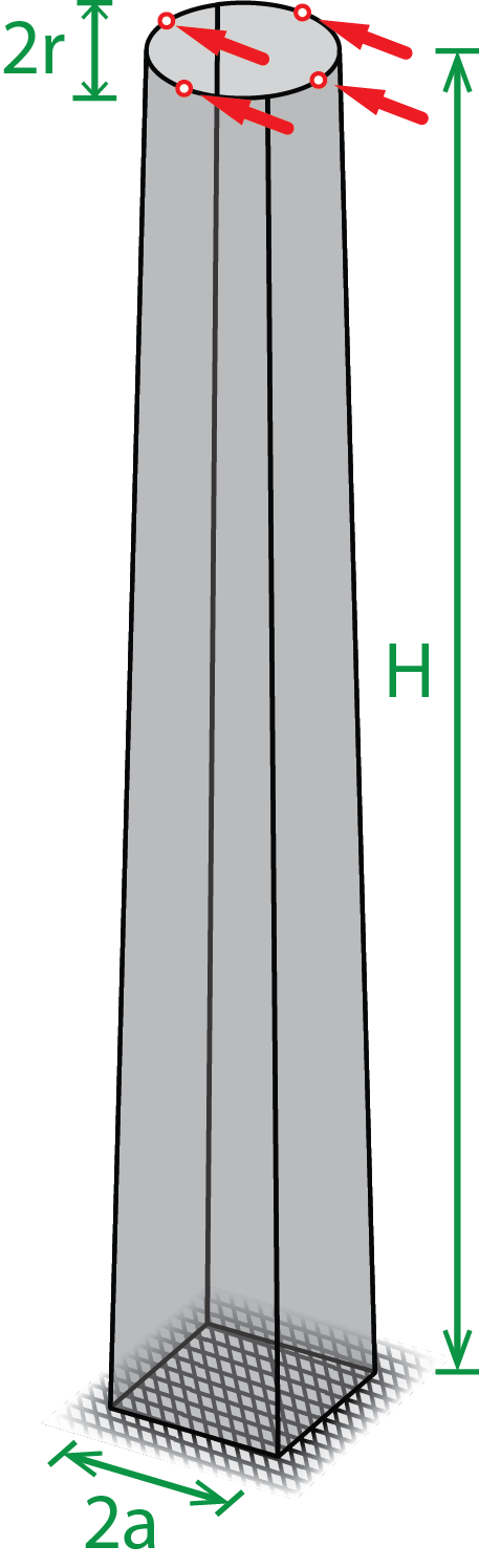 Domain is a thin-shell supported at the base and loaded at four points in the top. The cross-section of the domain varies linearly between a square at the bottom and a circle at the top. Based on a competition done by SOM.