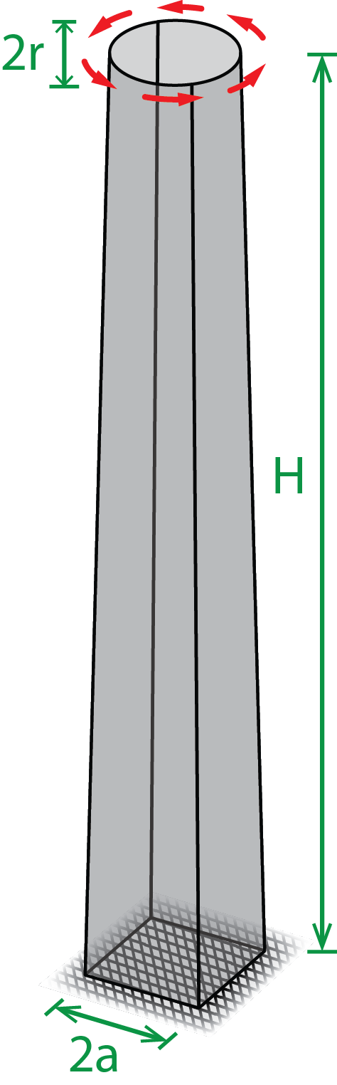 Domain is a thin-shell supported at the base and loaded by a moment at the top. The cross-section of the domain varies linearly between a square at the bottom and a circle at the top. Based on a competition done by SOM. Disclamer: Despite the relative agreement between this solution and the competition design, both solutions were obtained by different methods and objectives.